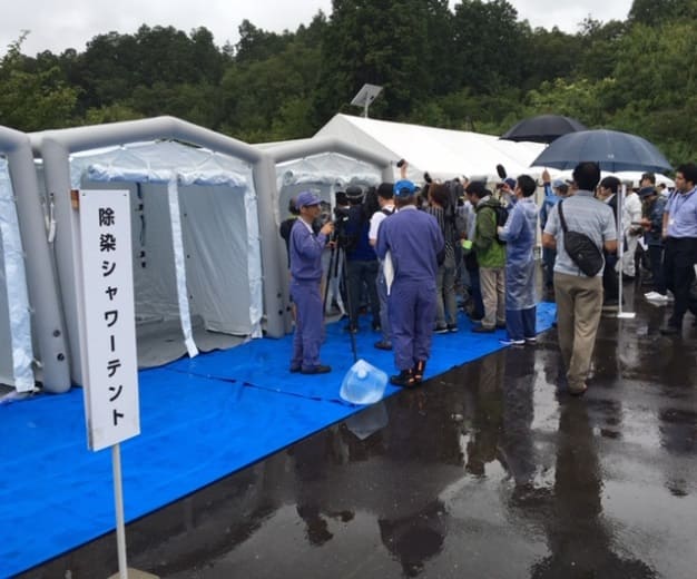 原子力事故が起きた時に被災地から避難する通過拠点において除染を行います。除染用テントを配置して大型車両や人を除染する施設とします。