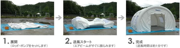 Air tents are very easy to assemble and set up. Conventional pipe tents are very difficult to set up because of the complicated framework and fabric attachment, and the weight of the frame type tents. Air tents, on the other hand, can be assembled simply by filling them with air. Even beginners can quickly set up an air tent.