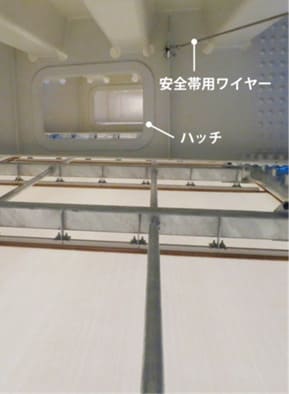 膜式点検足場の基本構造は図のように膜で橋の張り出し部、主桁間を膜パネルによって包み込み、内部には入退出用の専用ハッチ、安全帯用のワイヤーを備えた点検足場として利用します。専用部材によって定着された膜パネルは人が点検作業をするのに十分な強度を備えており、一般的な設計では耐荷重約350kg(おとな5人程度)で、要求に応じて荷重性能をさらに強くすることも可能です。
