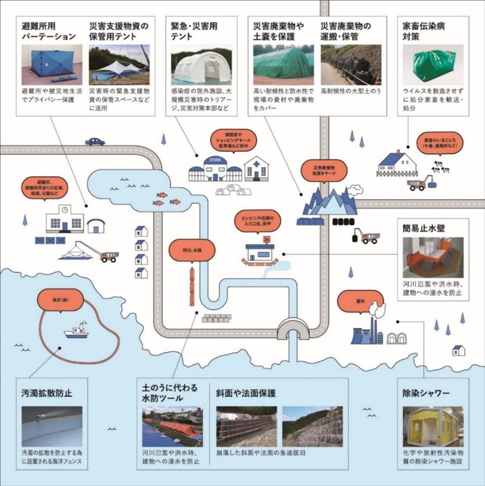 太陽工業では、街中や河川沿いなど多様な現場に対応する水害対策器材をはじめ、各種防災製品を幅広く展開しています。