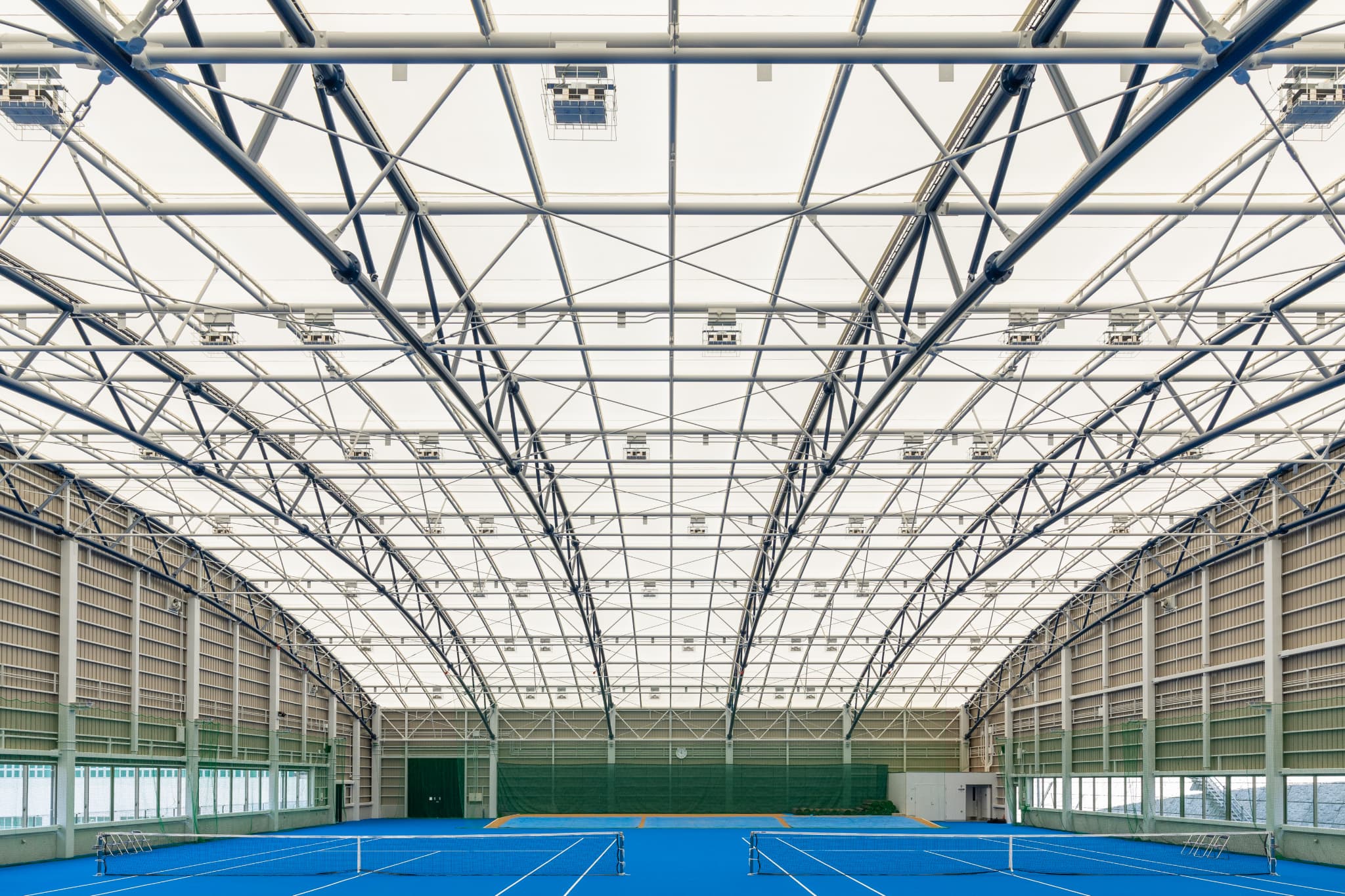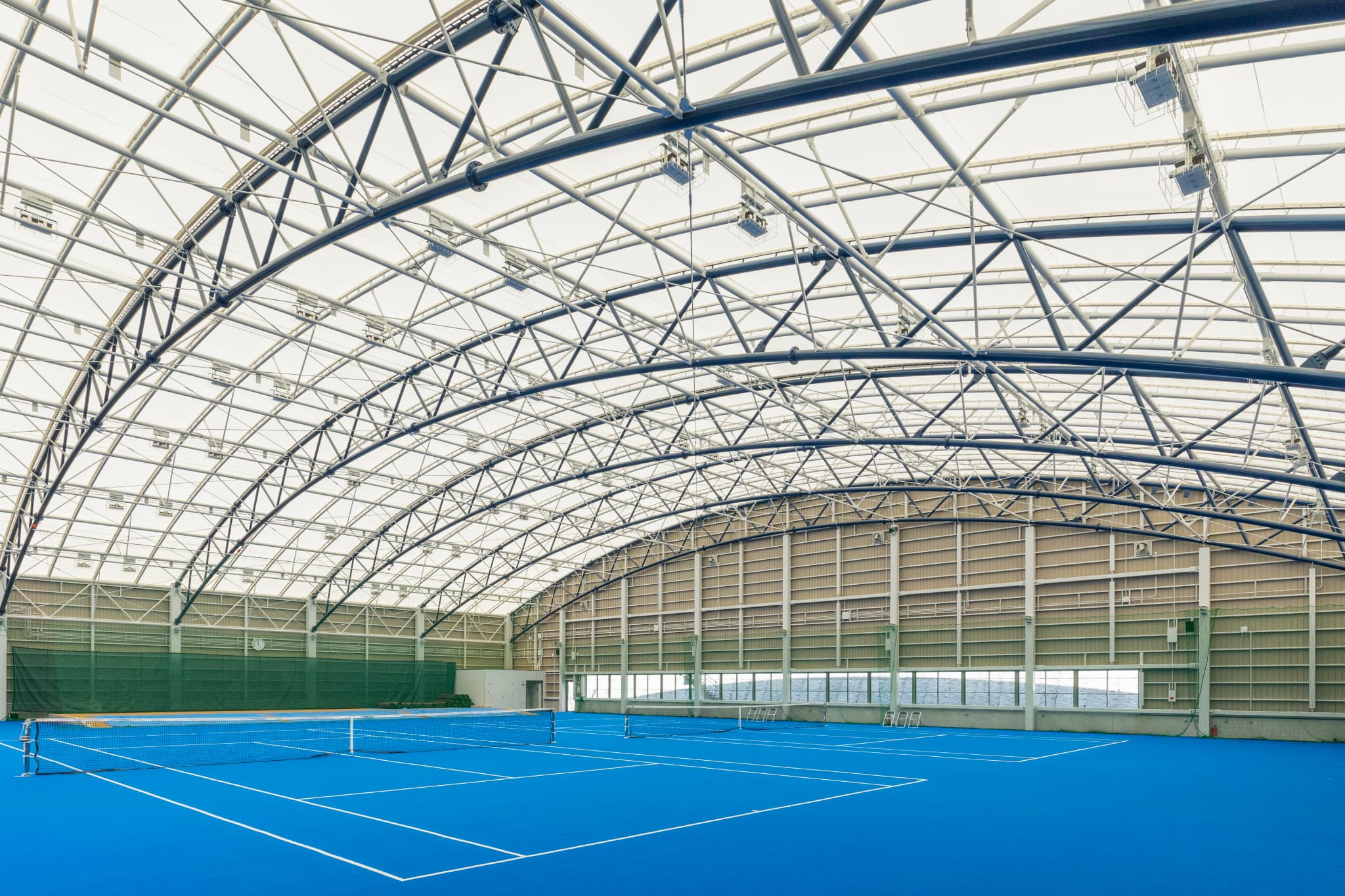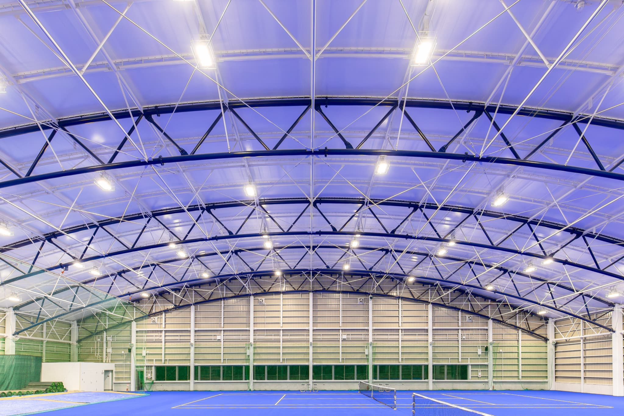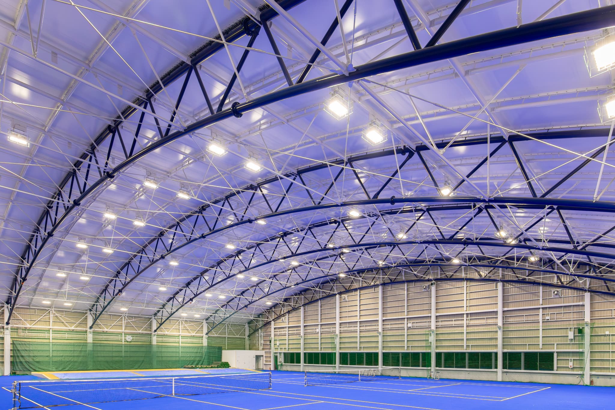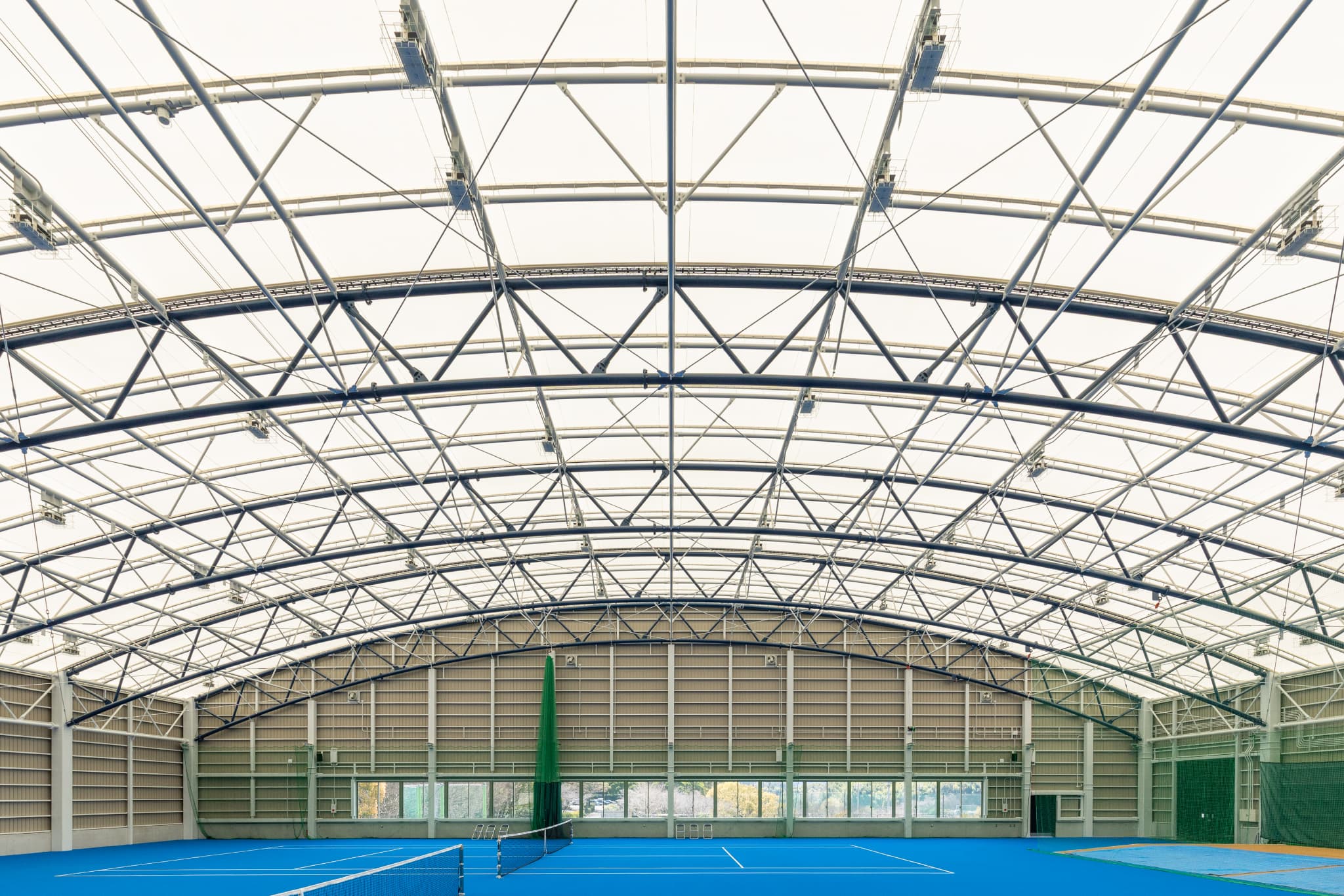 膜屋根で自然光を透過させ、トラス構造により無柱空間を作り出します。